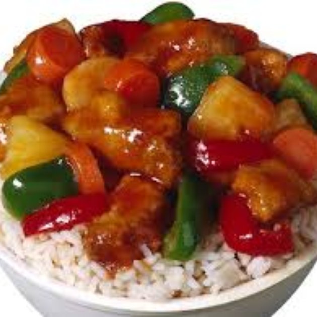 ανανάς, πράσινη και κόκκινη πιπεριά, φρ. κρεμμυδι, γλυκόξινη σάλτσα, σερβίρεται με ρύζι ατμού |